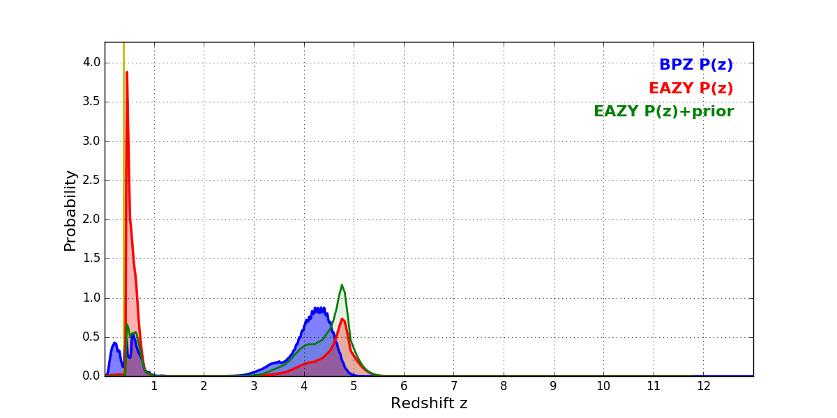 In P(z) plots: Yellow lines mark the cluster redshift z = 0.390,