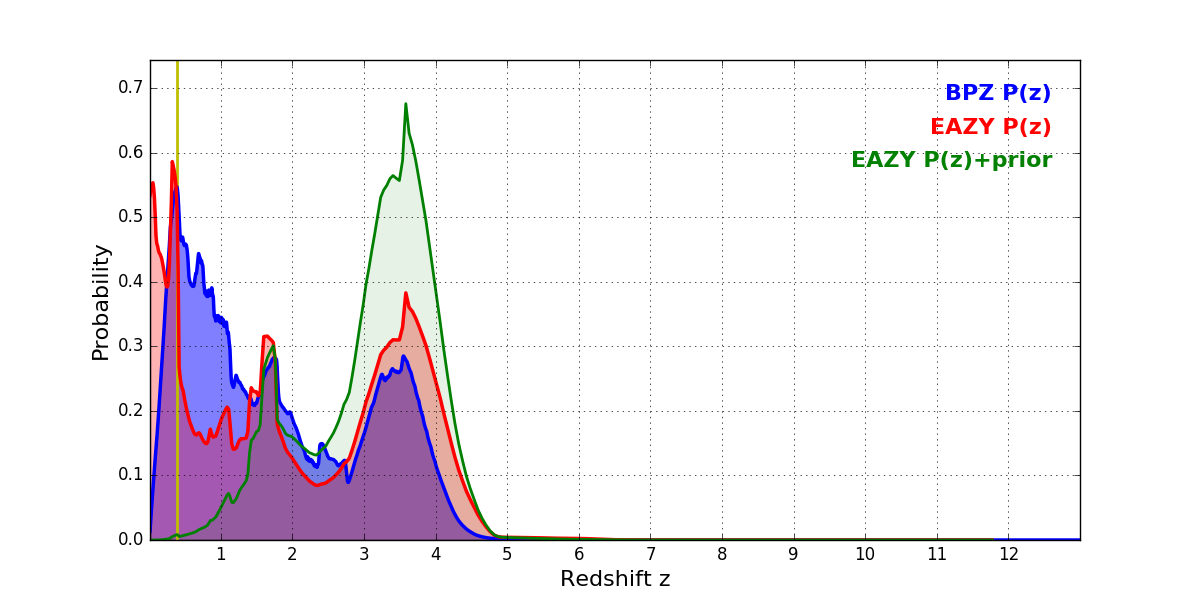 In P(z) plots: Yellow lines mark the cluster redshift z = 0.390,
