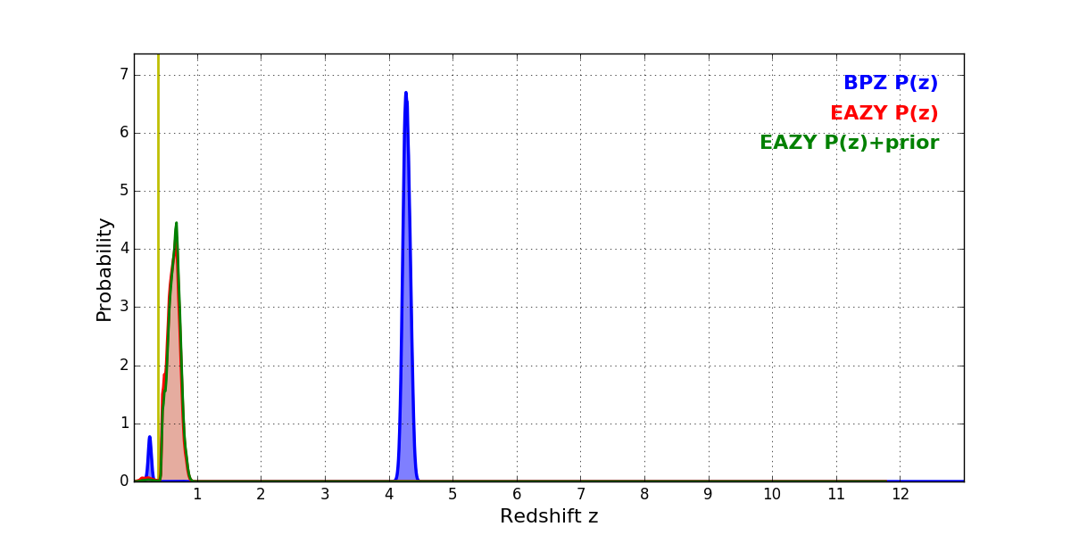 In P(z) plots: Yellow lines mark the cluster redshift z = 0.390,