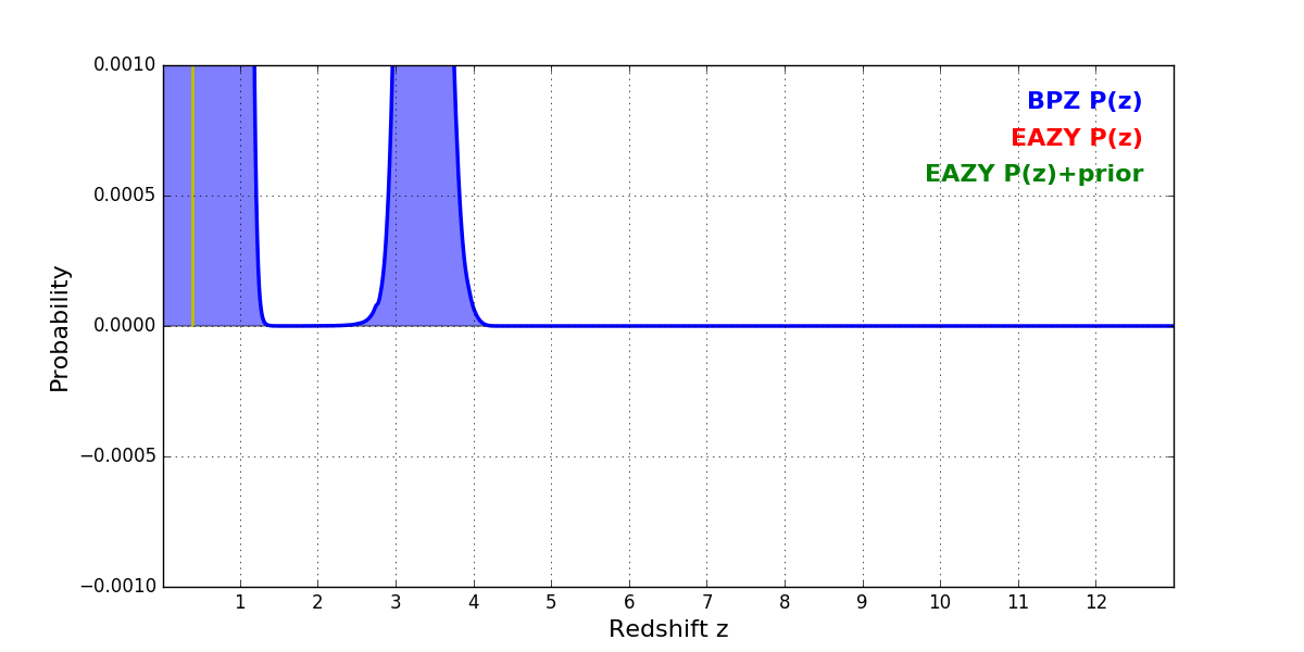 In P(z) plots: Yellow lines mark the cluster redshift z = 0.390,