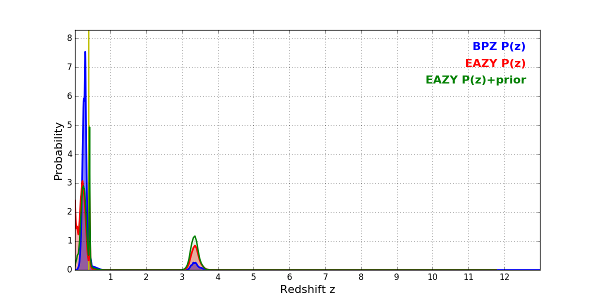 In P(z) plots: Yellow lines mark the cluster redshift z = 0.390,