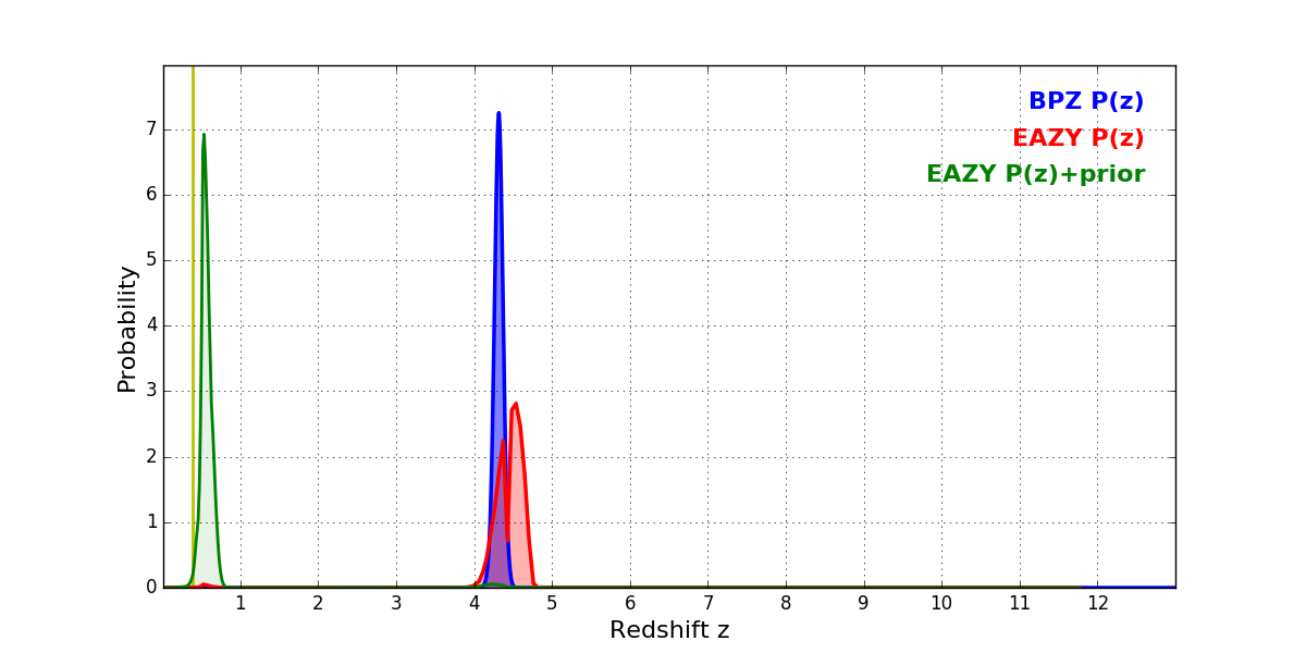 In P(z) plots: Yellow lines mark the cluster redshift z = 0.390,