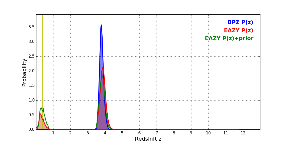 In P(z) plots: Yellow lines mark the cluster redshift z = 0.390,