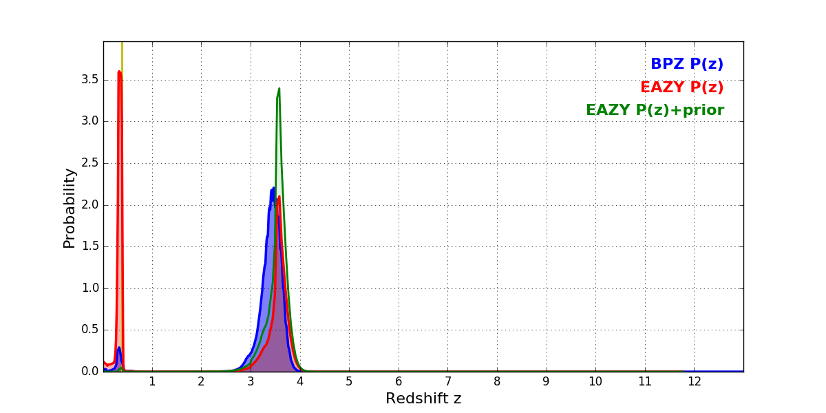 In P(z) plots: Yellow lines mark the cluster redshift z = 0.390,