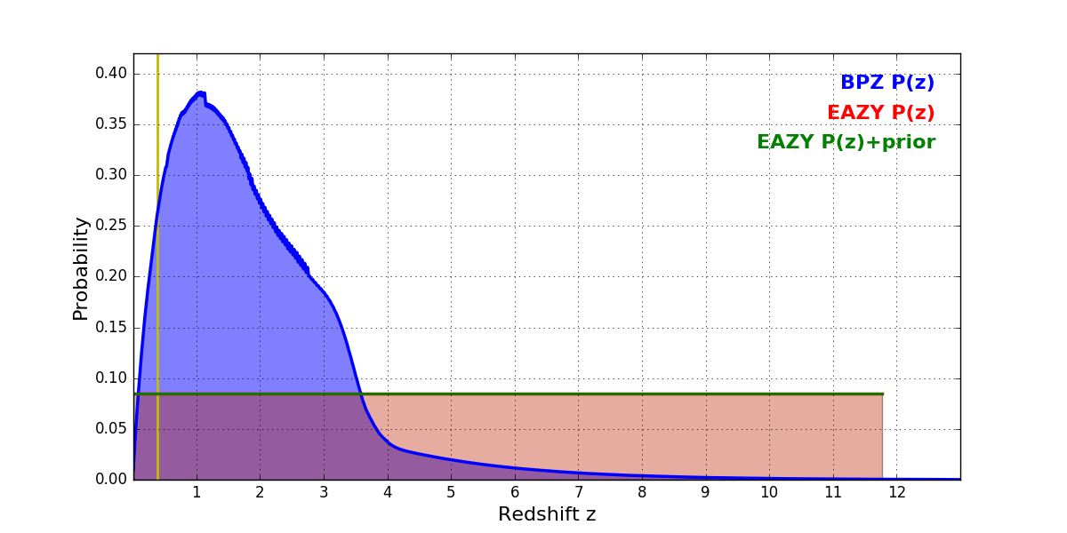 In P(z) plots: Yellow lines mark the cluster redshift z = 0.390,