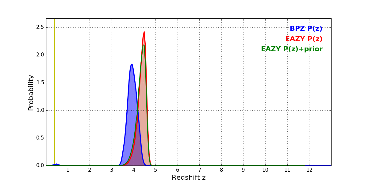 In P(z) plots: Yellow lines mark the cluster redshift z = 0.390,