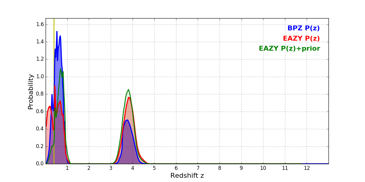 In P(z) plots: Yellow lines mark the cluster redshift z = 0.390,