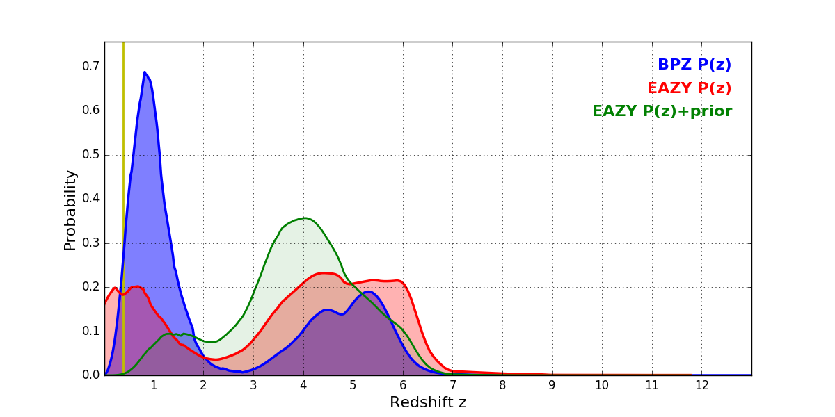 In P(z) plots: Yellow lines mark the cluster redshift z = 0.390,