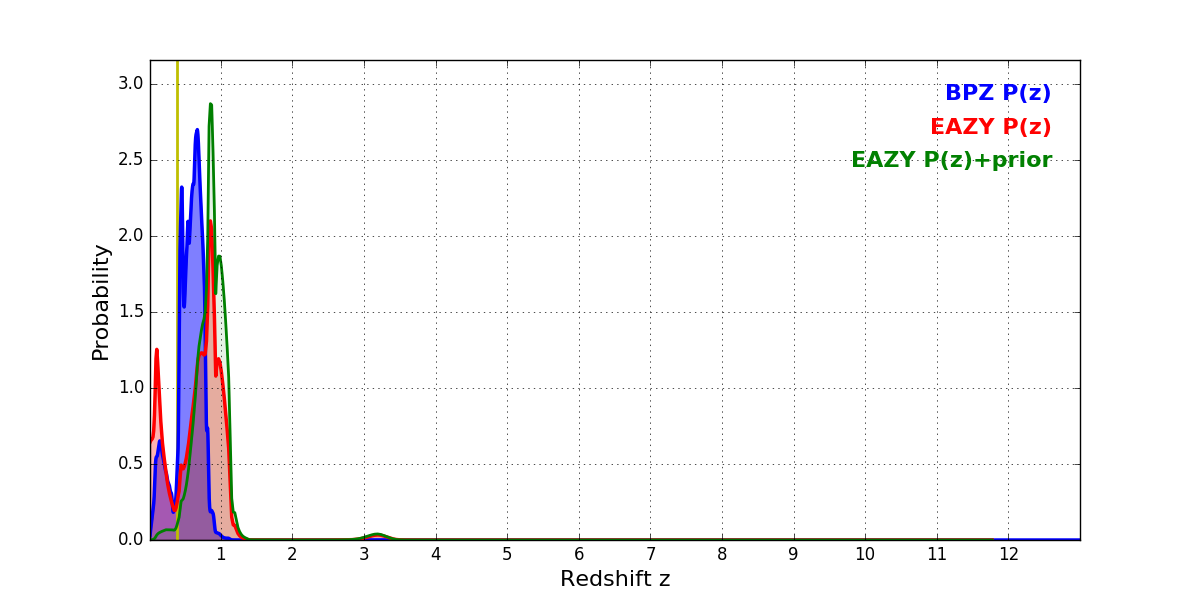 In P(z) plots: Yellow lines mark the cluster redshift z = 0.390,