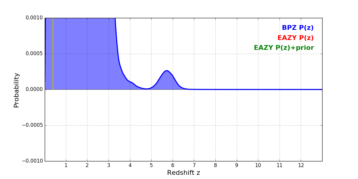 In P(z) plots: Yellow lines mark the cluster redshift z = 0.390,