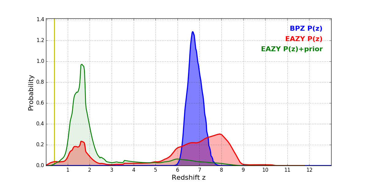 In P(z) plots: Yellow lines mark the cluster redshift z = 0.390,