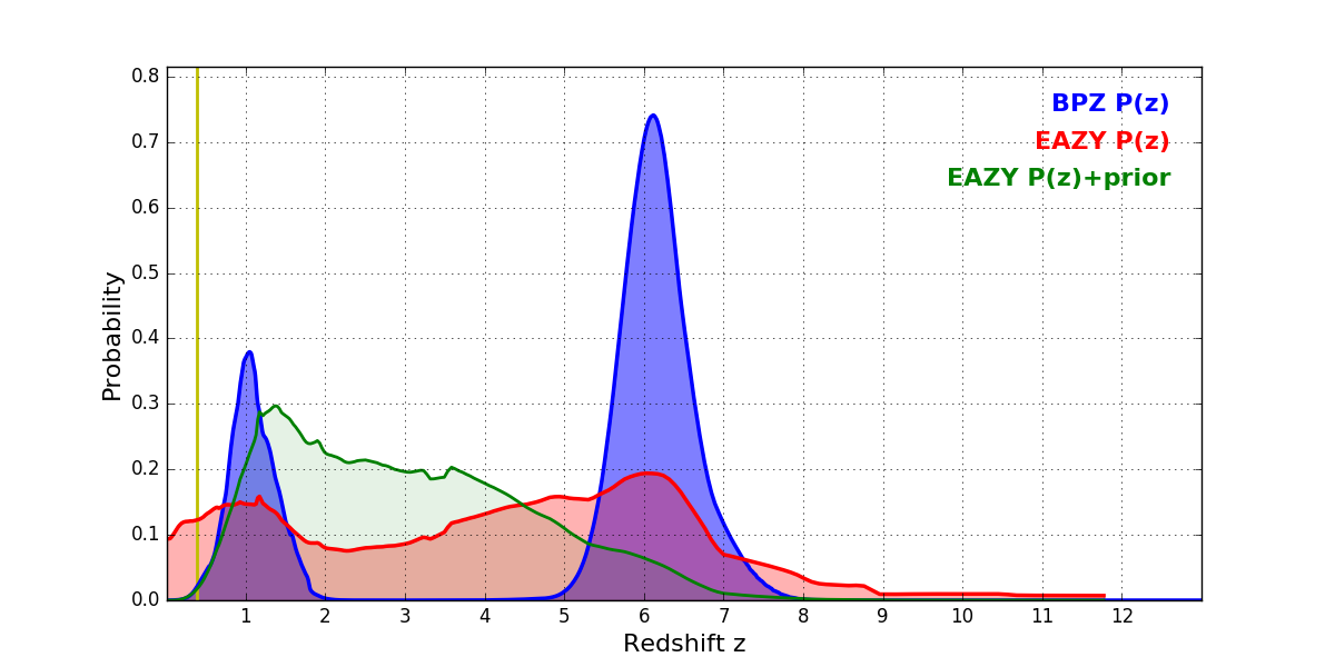 In P(z) plots: Yellow lines mark the cluster redshift z = 0.390,