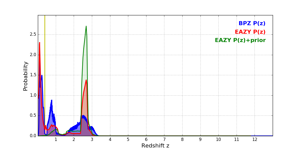 In P(z) plots: Yellow lines mark the cluster redshift z = 0.390,