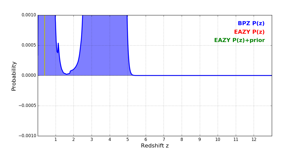 In P(z) plots: Yellow lines mark the cluster redshift z = 0.390,