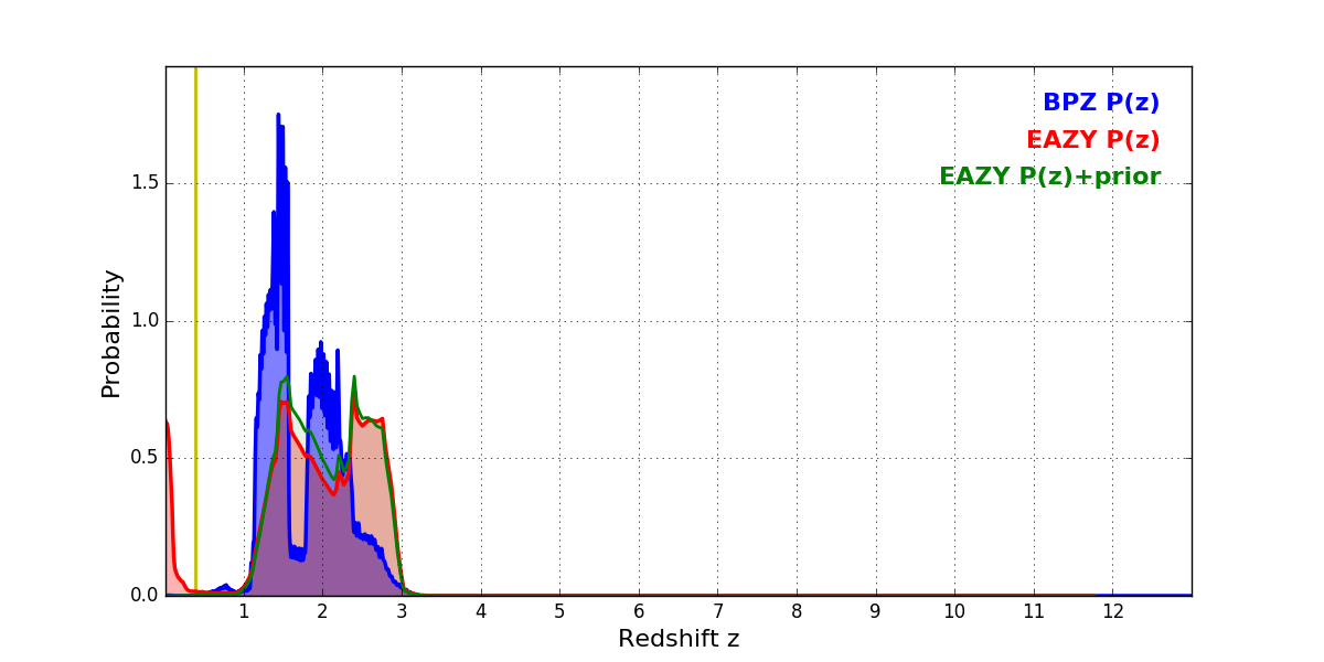 In P(z) plots: Yellow lines mark the cluster redshift z = 0.390,