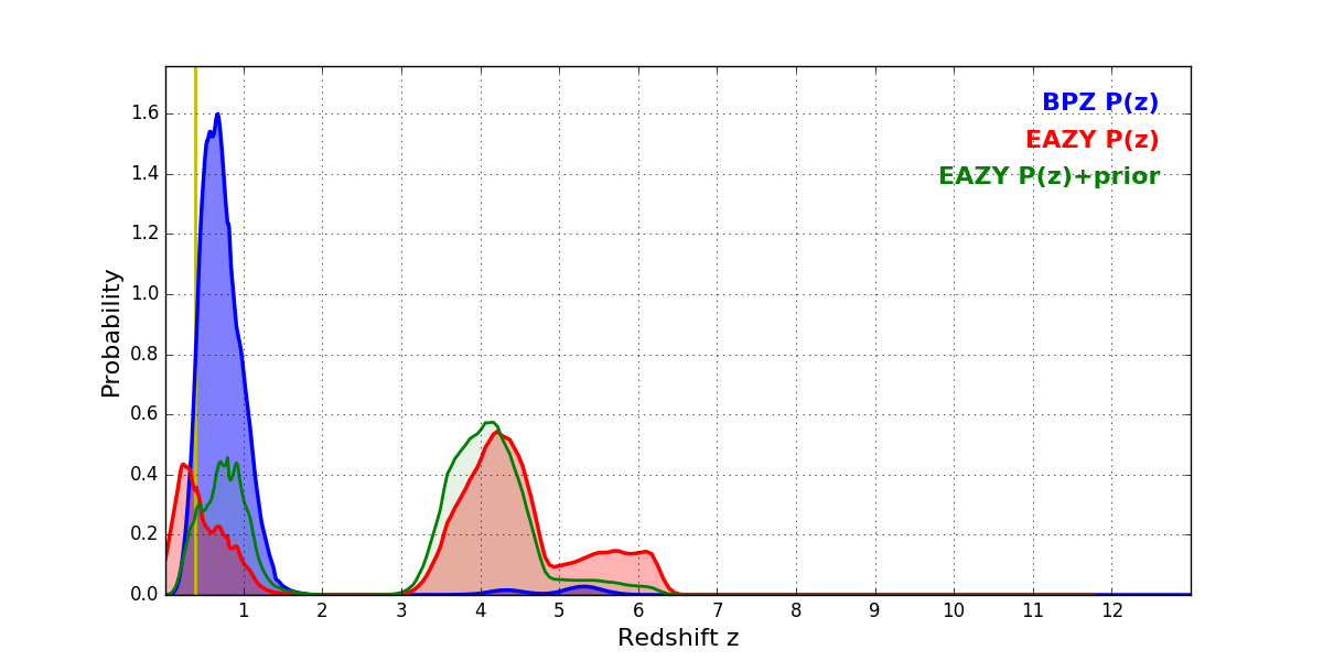 In P(z) plots: Yellow lines mark the cluster redshift z = 0.390,