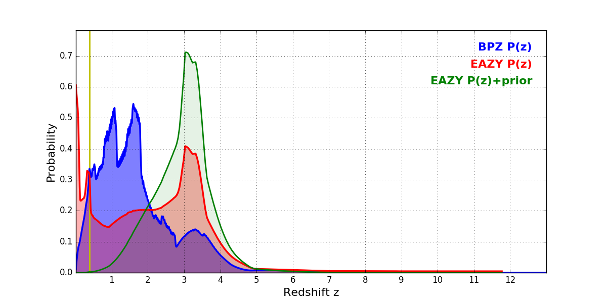 In P(z) plots: Yellow lines mark the cluster redshift z = 0.390,