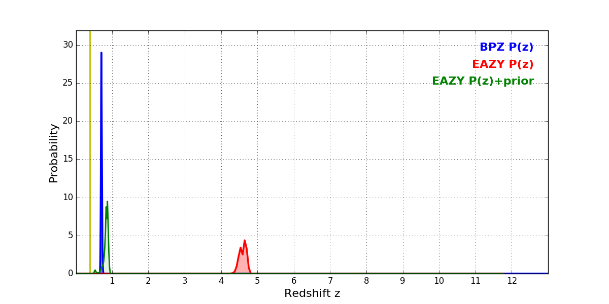 In P(z) plots: Yellow lines mark the cluster redshift z = 0.390,