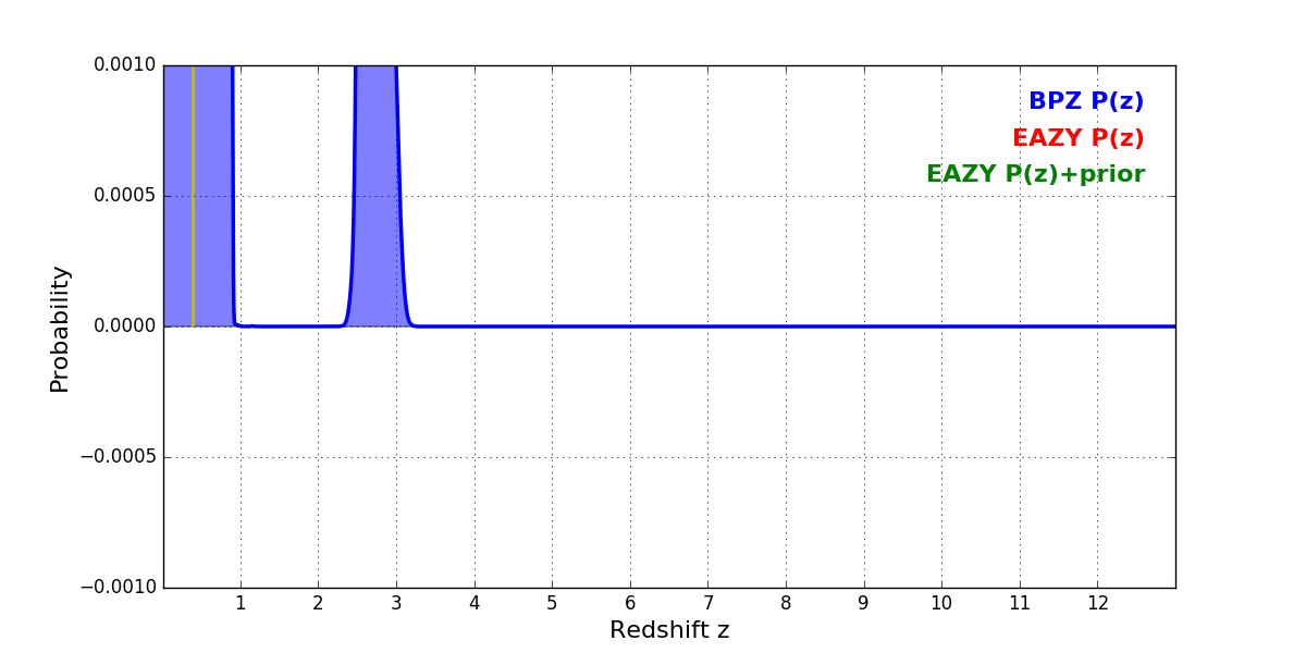 In P(z) plots: Yellow lines mark the cluster redshift z = 0.390,