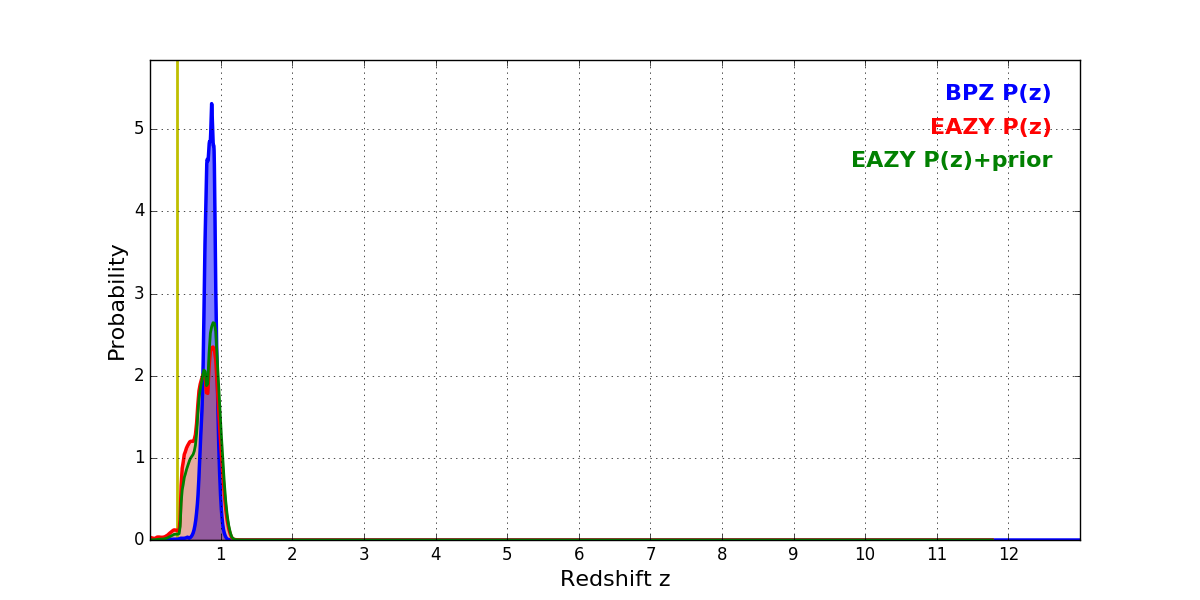 In P(z) plots: Yellow lines mark the cluster redshift z = 0.390,