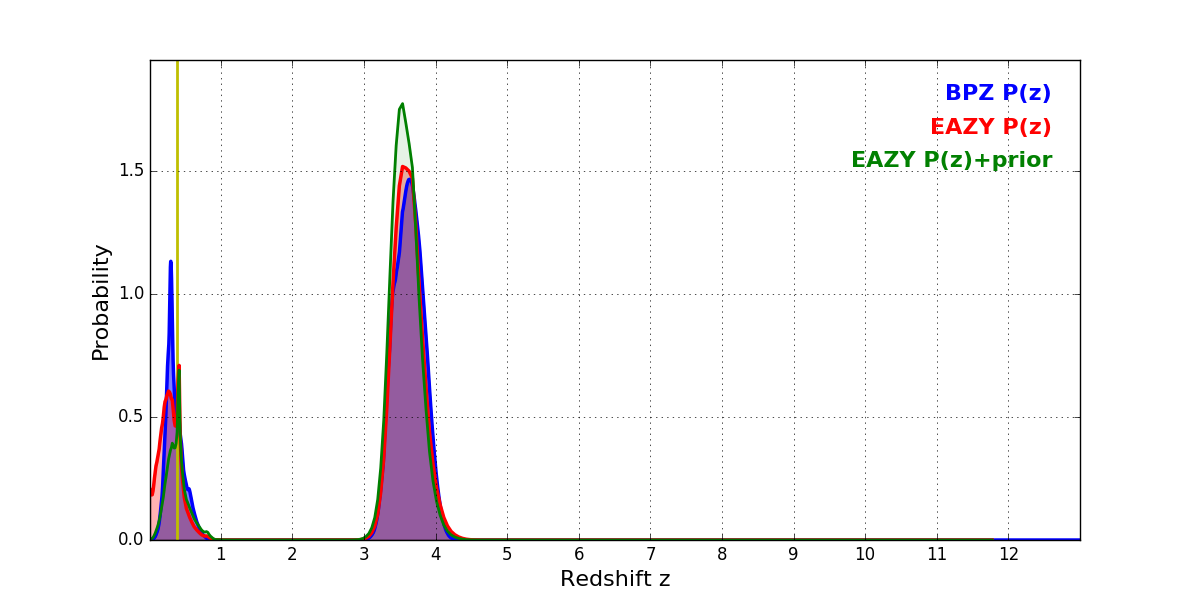 In P(z) plots: Yellow lines mark the cluster redshift z = 0.390,