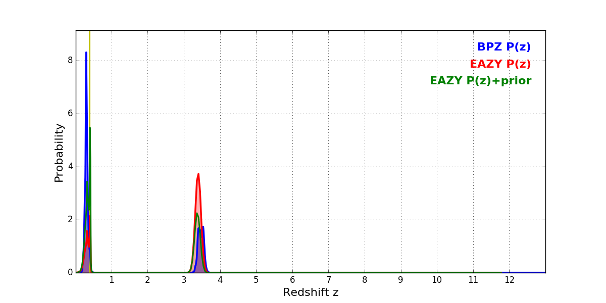 In P(z) plots: Yellow lines mark the cluster redshift z = 0.390,