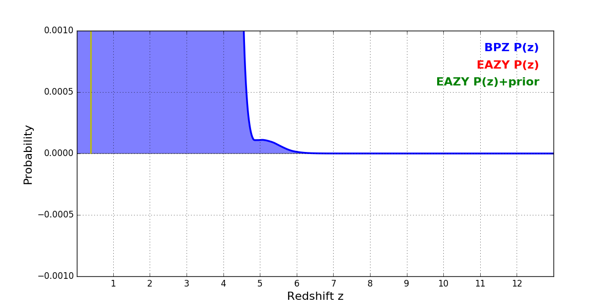 In P(z) plots: Yellow lines mark the cluster redshift z = 0.390,