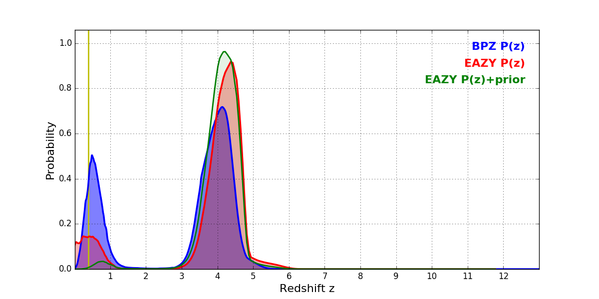 In P(z) plots: Yellow lines mark the cluster redshift z = 0.390,