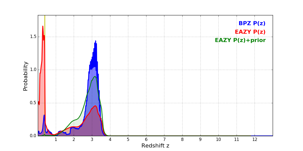 In P(z) plots: Yellow lines mark the cluster redshift z = 0.390,