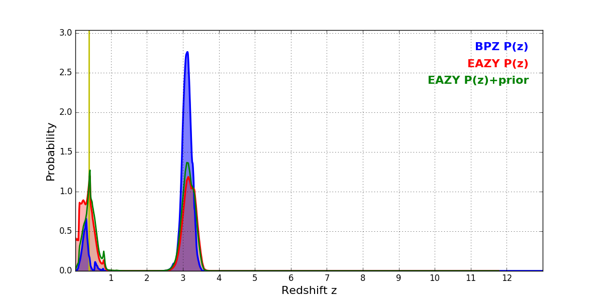 In P(z) plots: Yellow lines mark the cluster redshift z = 0.390,