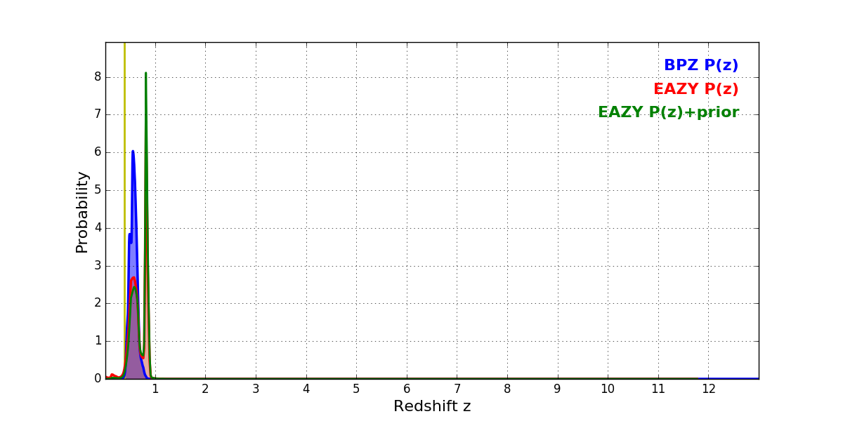 In P(z) plots: Yellow lines mark the cluster redshift z = 0.390,