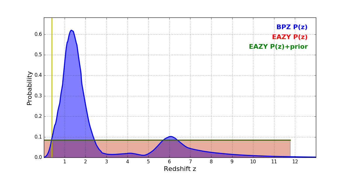 In P(z) plots: Yellow lines mark the cluster redshift z = 0.390,