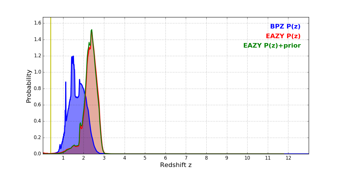 In P(z) plots: Yellow lines mark the cluster redshift z = 0.390,