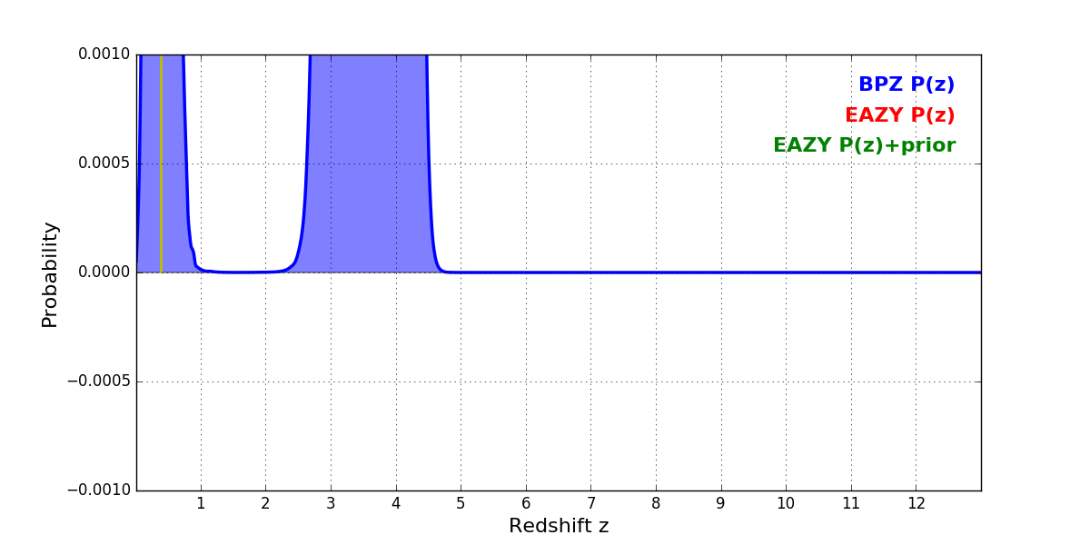 In P(z) plots: Yellow lines mark the cluster redshift z = 0.390,