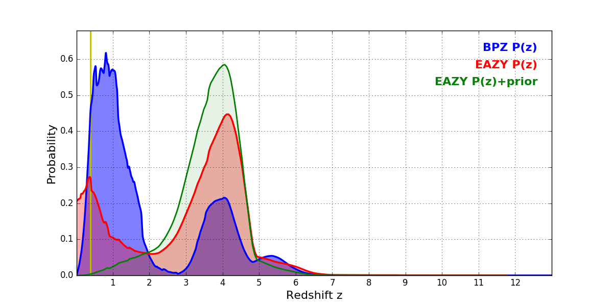 In P(z) plots: Yellow lines mark the cluster redshift z = 0.390,