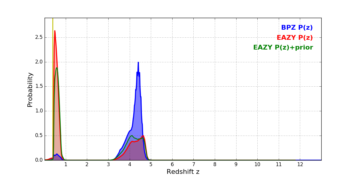 In P(z) plots: Yellow lines mark the cluster redshift z = 0.390,