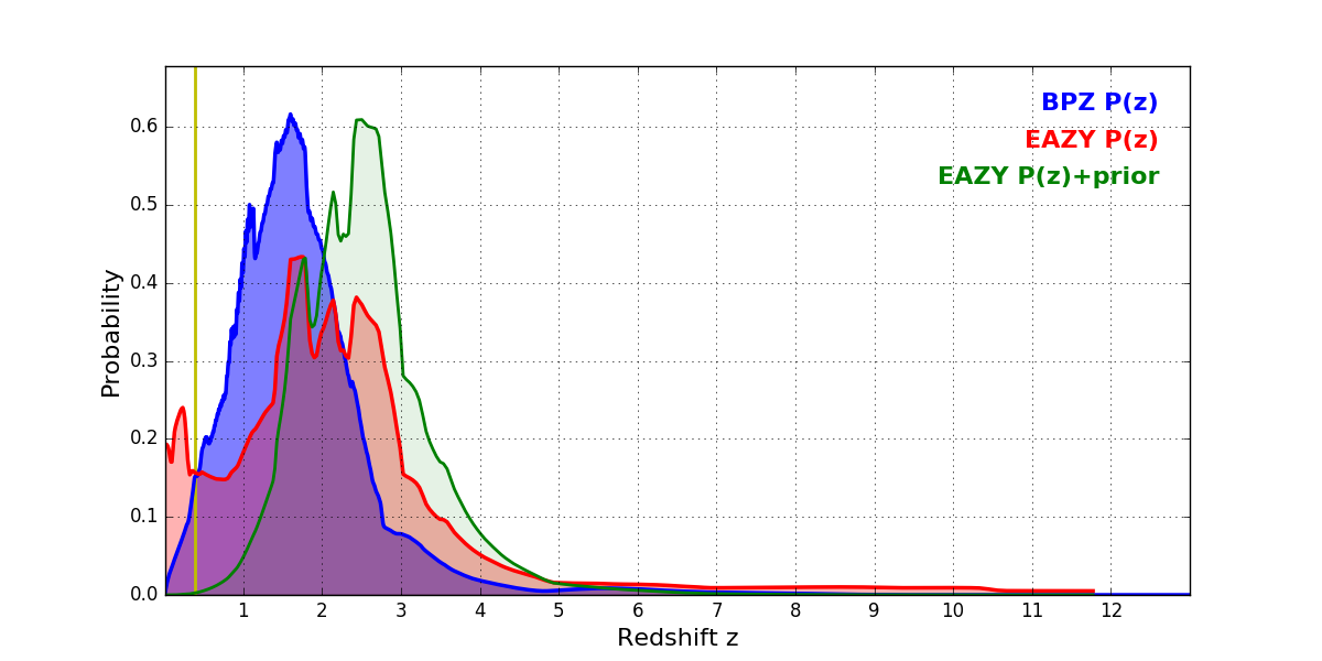 In P(z) plots: Yellow lines mark the cluster redshift z = 0.390,