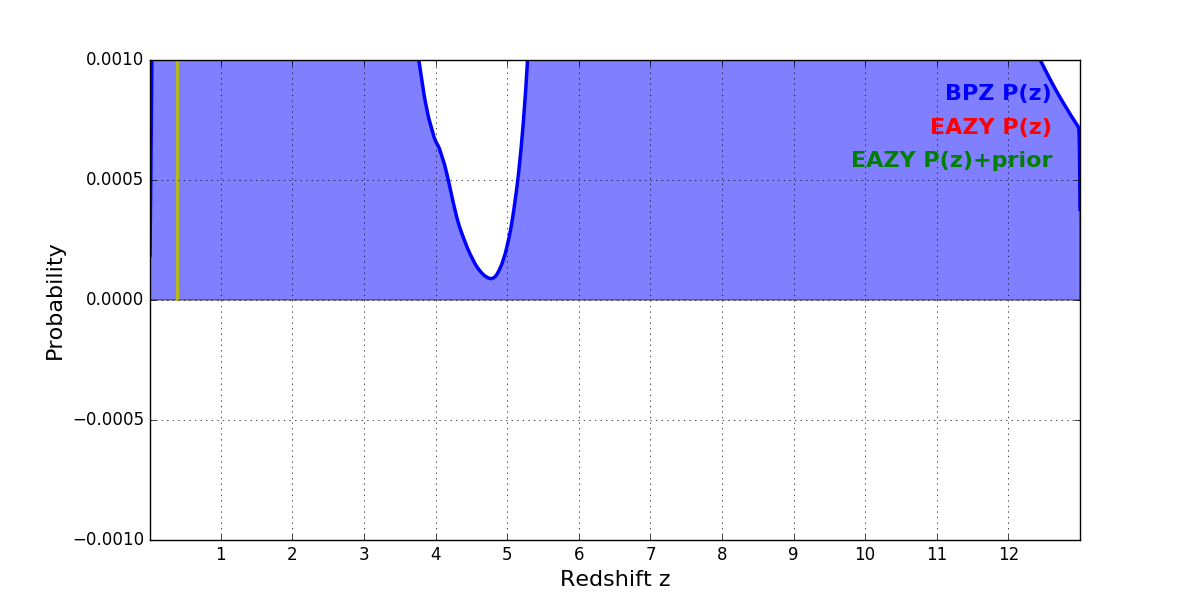 In P(z) plots: Yellow lines mark the cluster redshift z = 0.390,