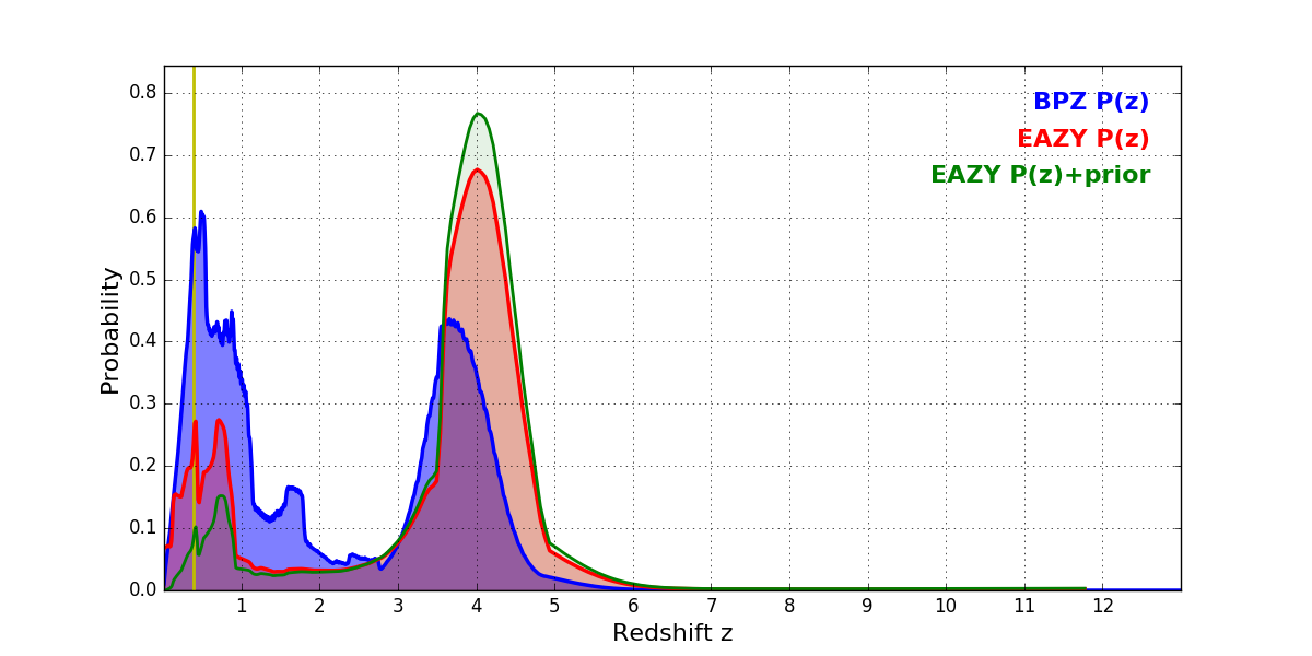 In P(z) plots: Yellow lines mark the cluster redshift z = 0.390,