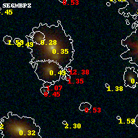 Black segments are analyzed here. Roll mouse over color images to view segments. Best viewed in a wide browser window (1200 pixels or more). Download SED & P(z) plots to view larger versions.