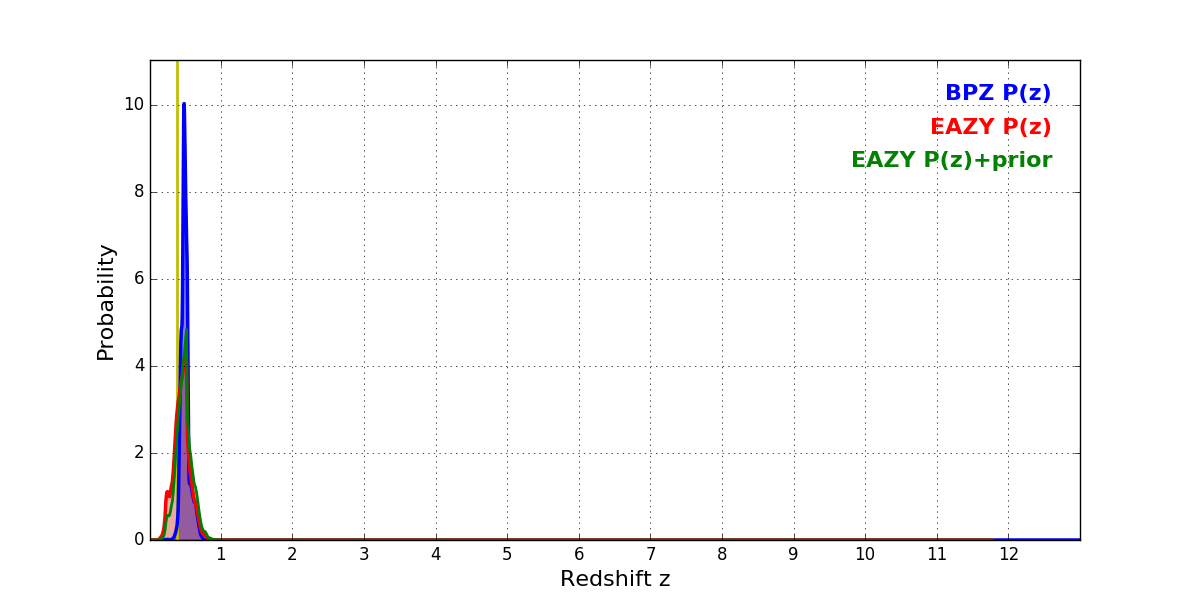 In P(z) plots: Yellow lines mark the cluster redshift z = 0.390,
