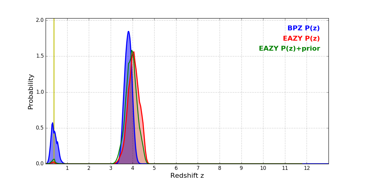 In P(z) plots: Yellow lines mark the cluster redshift z = 0.390,