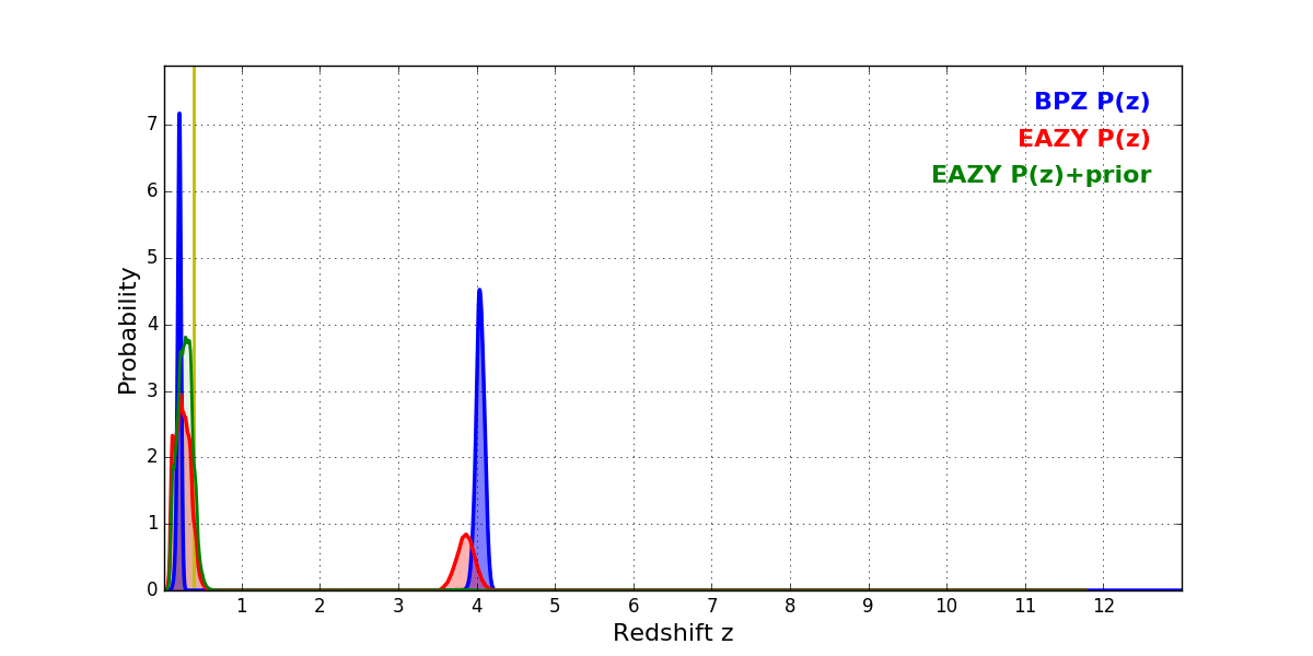 In P(z) plots: Yellow lines mark the cluster redshift z = 0.390,