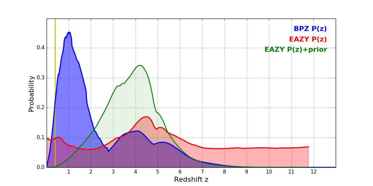 In P(z) plots: Yellow lines mark the cluster redshift z = 0.390,