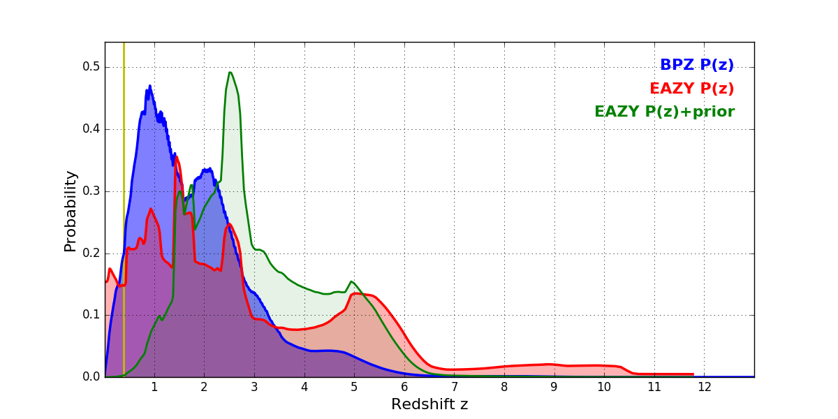 In P(z) plots: Yellow lines mark the cluster redshift z = 0.390,