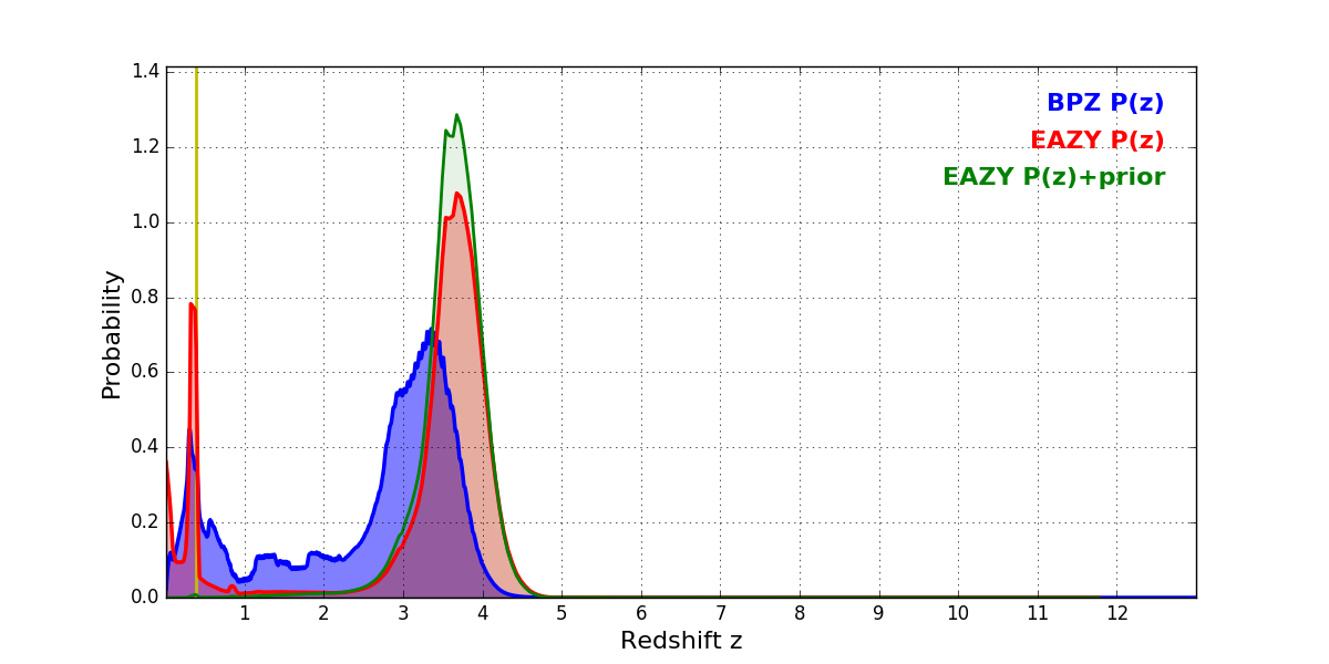 In P(z) plots: Yellow lines mark the cluster redshift z = 0.390,