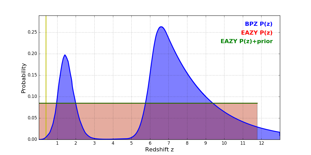 In P(z) plots: Yellow lines mark the cluster redshift z = 0.390,