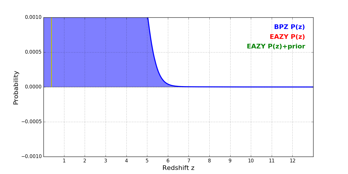 In P(z) plots: Yellow lines mark the cluster redshift z = 0.390,