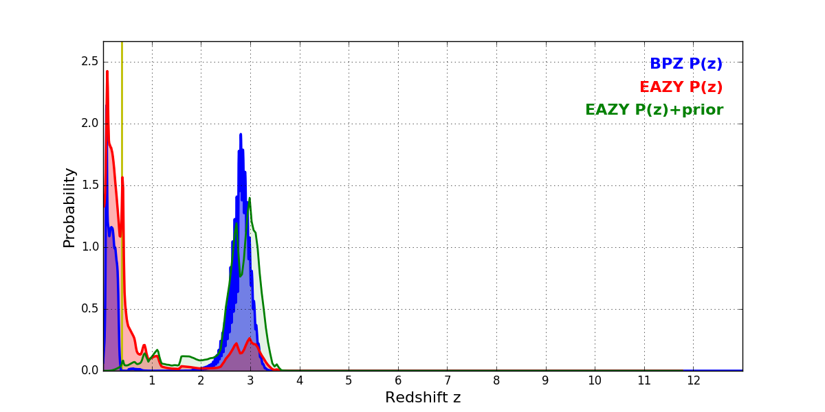 In P(z) plots: Yellow lines mark the cluster redshift z = 0.390,