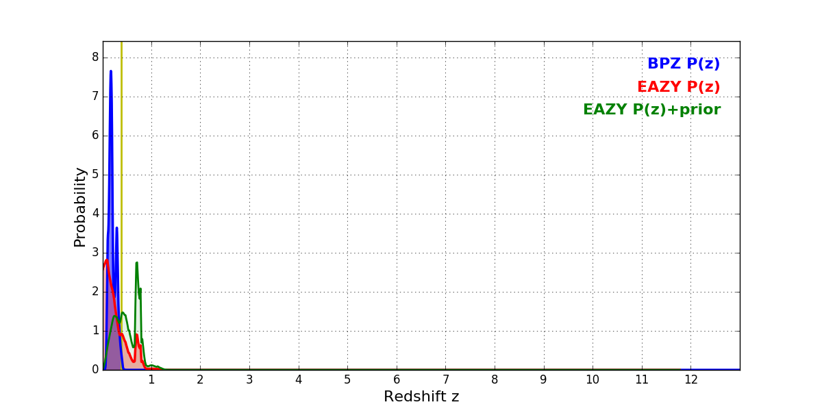 In P(z) plots: Yellow lines mark the cluster redshift z = 0.390,